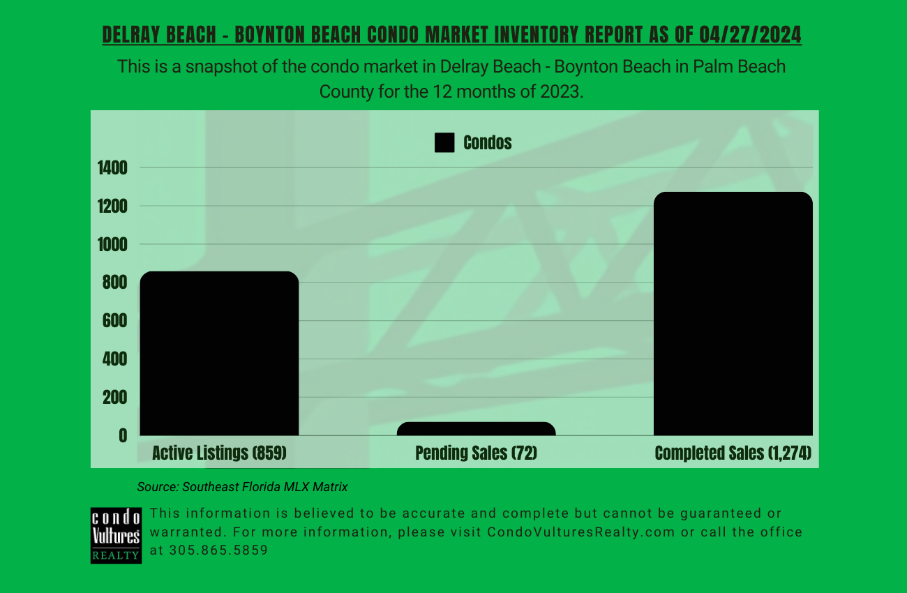 Based on the current active listings in the Multiple Listing Service – a database used by Realtors to market condos – the Delray Beach - Boynton Beach area is in a buyers market with a supply of nearly 860 units available for purchase.