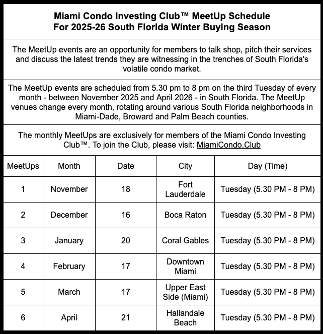 As with the Monthly Meetings, the Meetup events are exclusively for members of the Miami Condo Investing Club™.