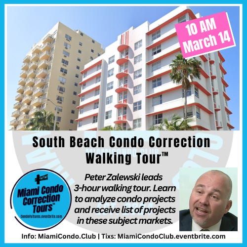 Expert Peter Zalewski will lead the final South Beach Condo Correction Walking Tour™ of the Winter Buying Season through a market with nearly 17,000 units at 10 am Saturday, March 14, 2026.